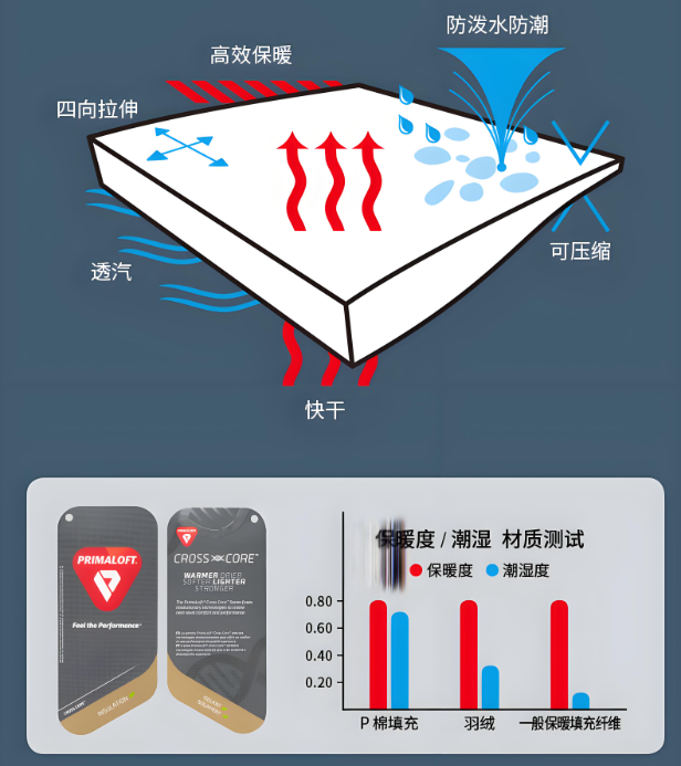 Primaloft 最初是為美國(guó)陸軍研發(fā),旨在模擬羽絨的保暖性,同時(shí)克服羽絨潮濕后保暖性驟降的缺點(diǎn)。它的核心優(yōu)勢(shì)包括: