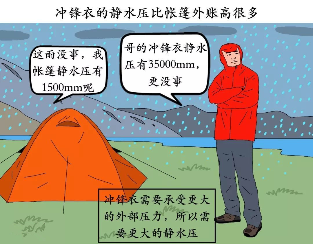 如果你仔細觀察帳篷的參數,會發現它們只有1200~5500mm的靜水壓值即可抵御雨水侵襲,而沖鋒衣則需要13000mm以上的靜水壓,這背后的原因就在于兩者所承受的外部壓力不同。
