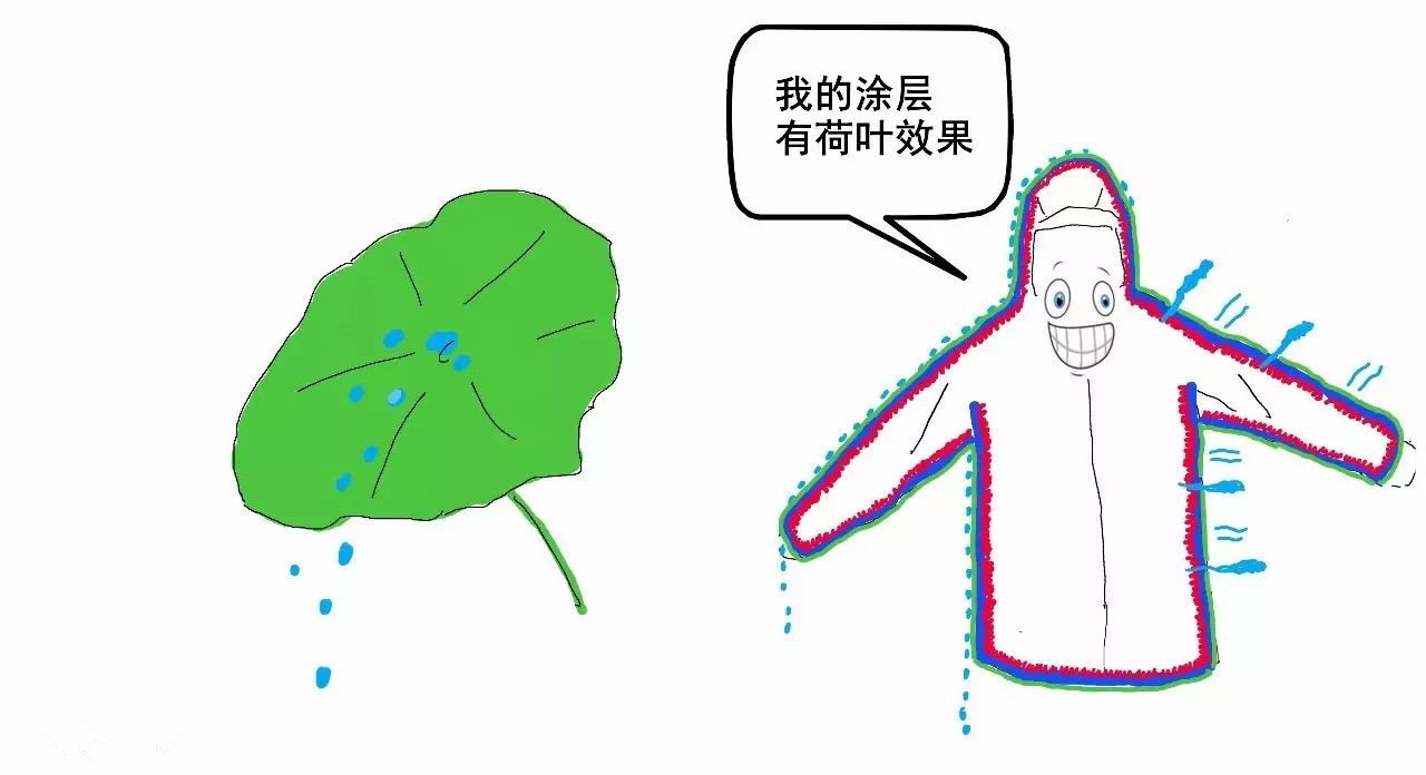 20世紀(jì)60年代中期,人們找到了一種防水涂層,對面料進(jìn)行了一定的改進(jìn)。當(dāng)面料經(jīng)過涂層處理后,雨水就像掉落在荷葉的表面一樣,結(jié)成小水珠。同時涂層很輕薄,水蒸氣通過面料縫隙仍然能排出。