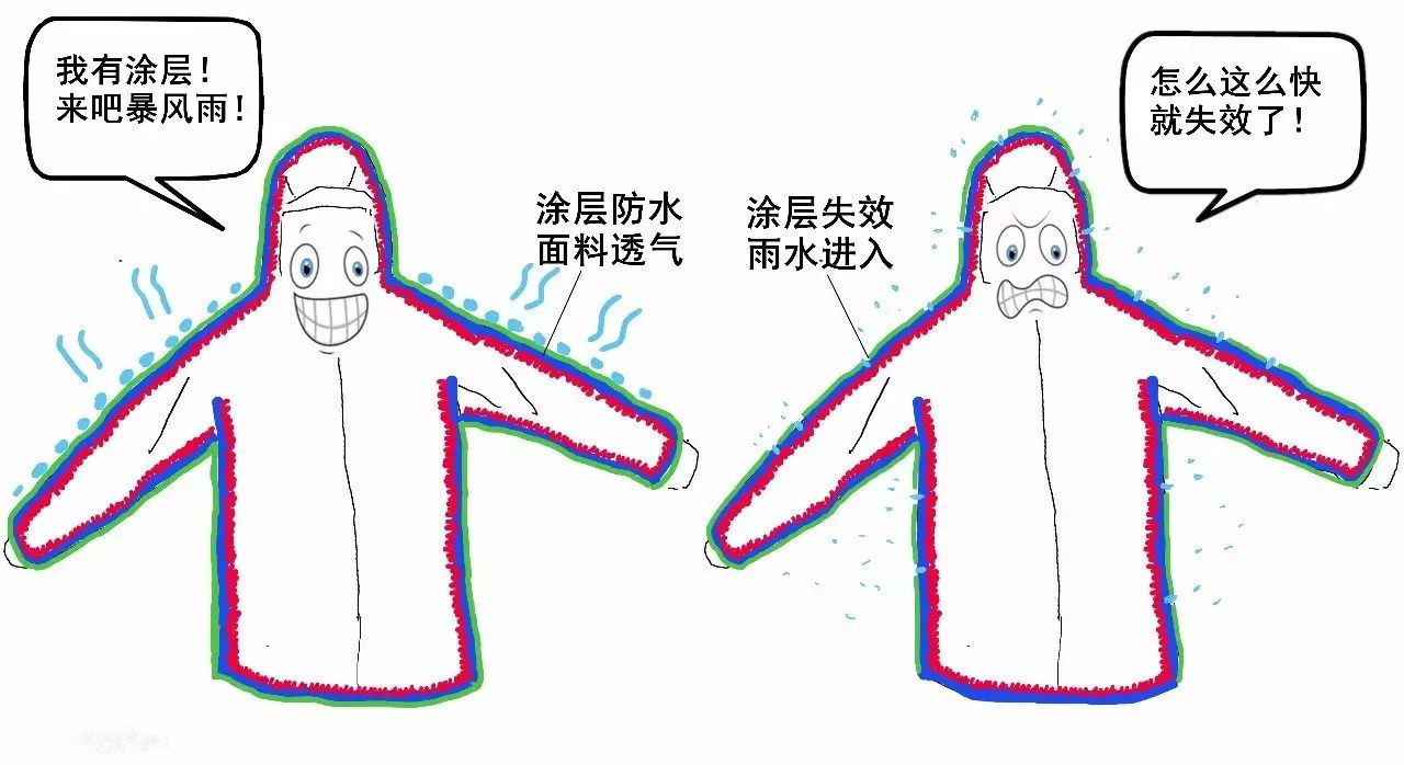 涂層損壞后衣服就會進(jìn)水。