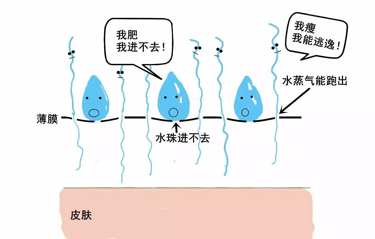 2)因?yàn)樗魵獗人樾『芏啵魵夂芗?xì)小,可以鉆過沖鋒衣薄膜的小孔排出。