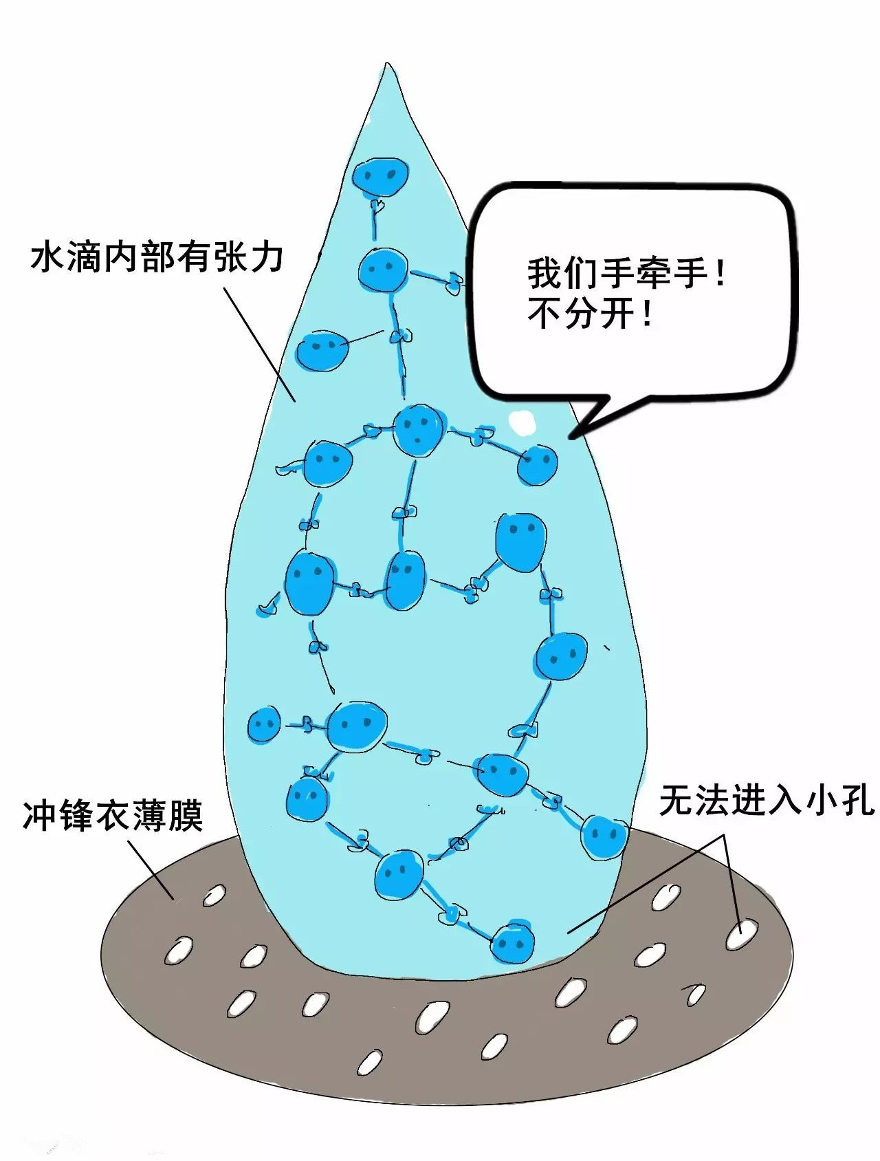 1)水滴內(nèi)部的張力讓它無法進(jìn)入薄膜。因?yàn)橛甑蔚摹皬埩Α焙軓?qiáng),水分子之間強(qiáng)烈吸引,就像抱團(tuán)在一起。當(dāng)雨滴接觸薄膜時,沒有水分子愿意離開水滴。