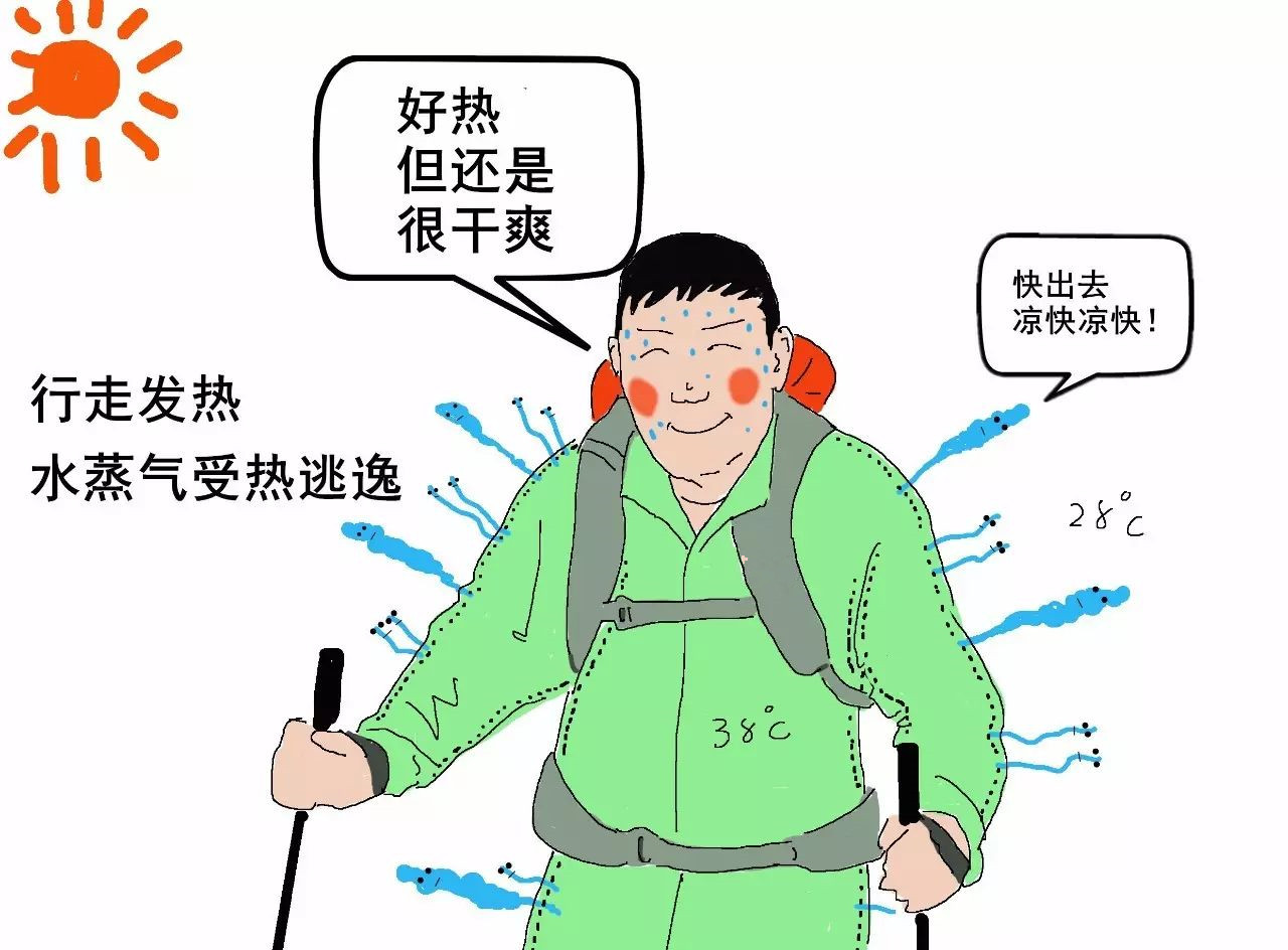 1)人體熱量促進(jìn)水蒸氣逃逸。登山時,人體溫升高,內(nèi)部的溫度大于外界空氣,促使汗氣向沖鋒衣外擴(kuò)散。薄膜上的小孔就像工廠的煙囪,為水蒸氣提供了排放通道。