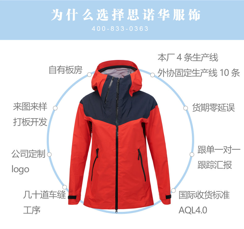 防水拉鏈:單層沖鋒衣生產使用YKK防水壓膠拉鏈,承受數(shù)萬次拉合,可根據(jù)客戶的要求進行定制特殊配件。
