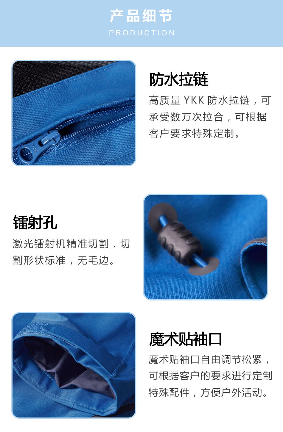 魔術貼袖口:魔術貼袖口自由調節(jié)松緊,可根據(jù)客戶的要求進行定制特殊配件,方便戶外活動。